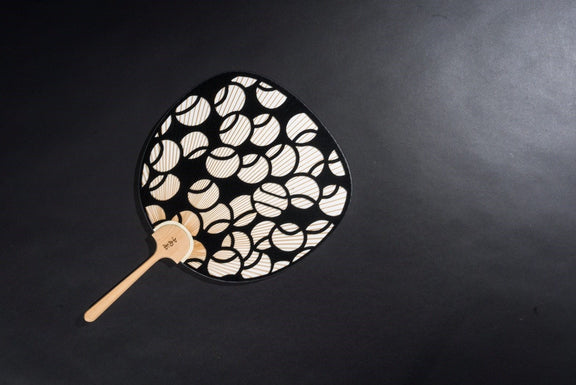 Handcrafted Round fan depicting a geometric and minimalist design.