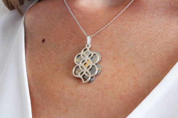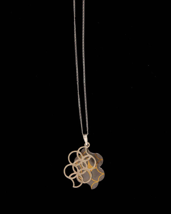 Silver necklace with an inlay pendant featuring gold detailing and a cut overlay pendant. Both pendants feature the Shippo pattern, symbolising the seven treasures and happiness in Japanese culture.