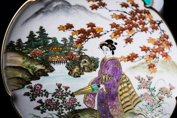 Intricately hand-painted satsuma ware plate featuring an Autumn scene. A true showcase of Japanese design.